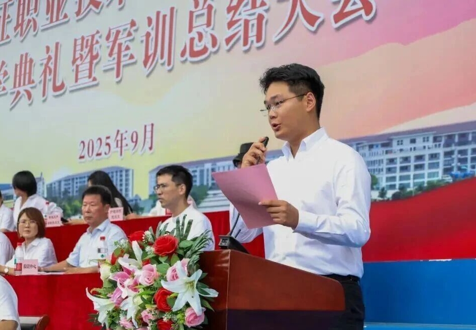 建筑工程学院25级建筑装饰工程技术班周颖超作为新生代表发言。他致谢师长、致敬教官,相信在 “长征” 精神的激励下,全体师生定能不断超越自我,努力成为一名合格的新“长征人”。