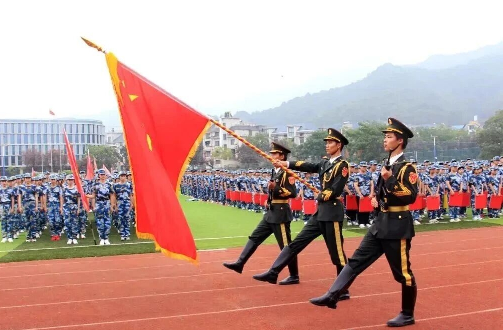 迈着铿锵步伐,英姿飒爽,中国人民解放军军旗率先入场,点燃了全场师生的激情。