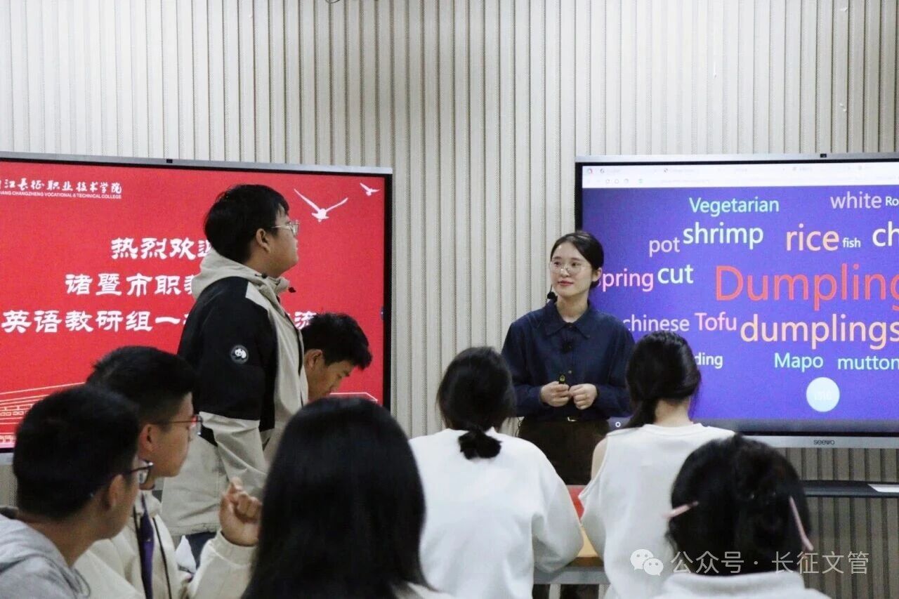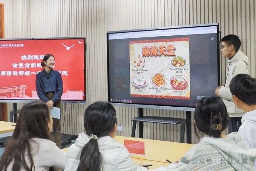 在观摩课环节,公外教研室张燕婷老师以“Chinese Cuisine”为主题呈现了一堂生动的《大学英语》课程。她巧妙运用图片、视频、游戏PK与小组任务等多种方式,激发学生参与热情,引导学生在掌握中国饮食文化相关英语表达的同时,提升口语应用与跨文化沟通能力。观摩课上活跃的课堂气氛、AI等现代化教学手段的融合应用,获得了来访教师的一致好评。