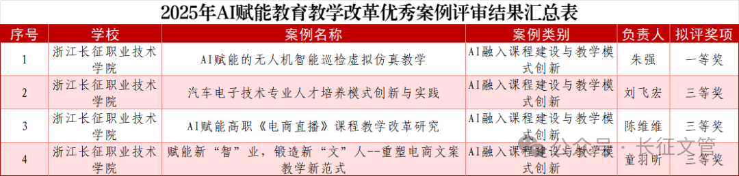 近日,浙江省高等教育学会智能教育分会公布了2025年数字化教育教学改革优秀案例评选结果,我校智能技术学院朱强团队《AI赋能的无人机智能巡检虚拟仿真教学》荣获一等奖、智能技术学院刘飞宏团队《汽车电子技术专业人才培养模式创新与实践》、商务与贸易学院陈维维团队《AI赋能高职<电商直播>课程教学改革研究》和童羽昕团队《赋能新“智”业,锻造新“文”人--重塑电商文案教学新范式》获三等奖,全面展现了我校在数智化教学改革前沿的深厚实力和创新活力。